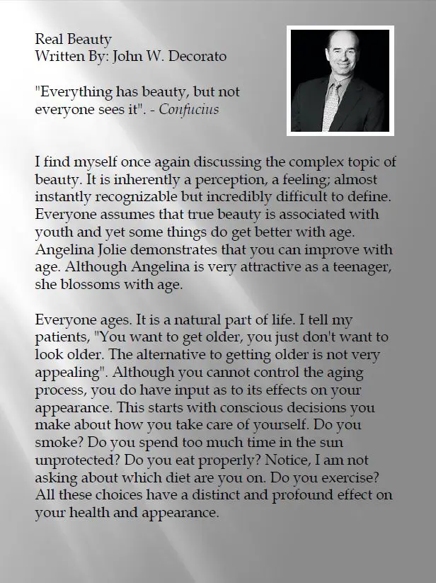 One of Staten Island’s top cosmetic surgeons, John W. Decorato, M.D., believes that your choice of plastic surgeon is essential to the success of any procedure. Before selecting either a procedure or a surgeon, learn everything you can about the procedures available and about the doctor. Well-informed patients are able to forge a comfortable professional relationship with their surgeon and actively participate in discussions about the desired procedure.